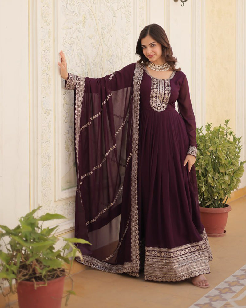 This Wine Color Faux Blooming Rich Sequence Embroidered Gown is a stunning epitome of sophistication and glamour. Adorned with intricate blooming patterns and rich sequence embroidery, the gown exudes opulence. The deep wine hue adds a touch of allure, making it perfect for special occasions or formal events. With its elegant design and luxurious fabric, this gown promises to make a statement, ensuring a memorable and refined look for the wearer. Step into the spotlight with confidence in this captivating wine-colored gown.