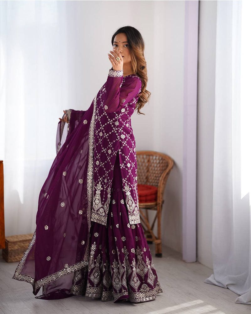 Embrace elegance with this Wine Color Faux Georgette Sharara Suit. Featuring a flowy silhouette and subtle detailing, it offers a graceful look perfect for festive events, parties, or traditional gatherings.
