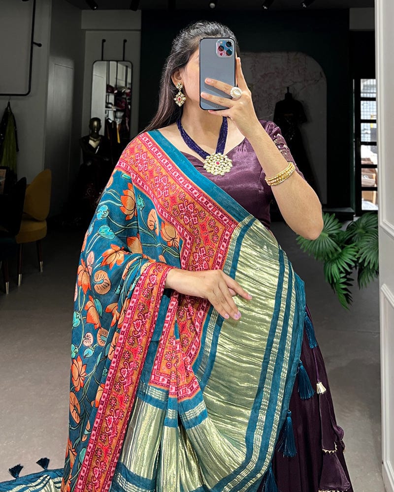 This stunning wine-colored lehenga choli is crafted from luxurious Gaji silk, offering a rich and elegant appearance. The lehenga is adorned with intricate real mirror work, adding a sparkling touch to the traditional design. Paired with an unstitch blouse, this ensemble provides the perfect blend of traditional craftsmanship and modern elegance, making it ideal for special occasions.