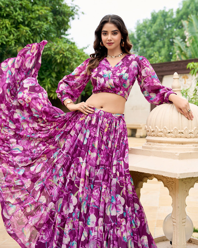 Wine Color Georgette Printed Crop Top Lehenga Choli