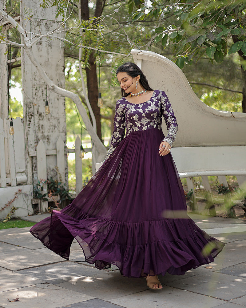 Make a statement of refined glamour in our Wine Color Jacquard Designer Anarkali Gown, elegantly fully stitched for your convenience. The deep wine hue exudes sophistication, while the intricate jacquard weaving adds a touch of texture and luxury. The Anarkali silhouette gracefully flows, creating a regal and flattering look that's perfect for special occasions. Meticulously designed and thoughtfully stitched, this gown ensures effortless style with a touch of traditional charm. Elevate your wardrobe with the Wine Color Jacquard Designer Anarkali Gown, a flawless combination of opulence and timeless appeal that promises to turn heads at any event.