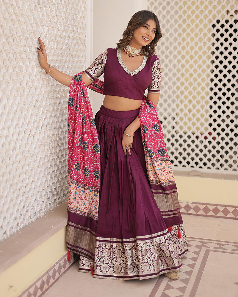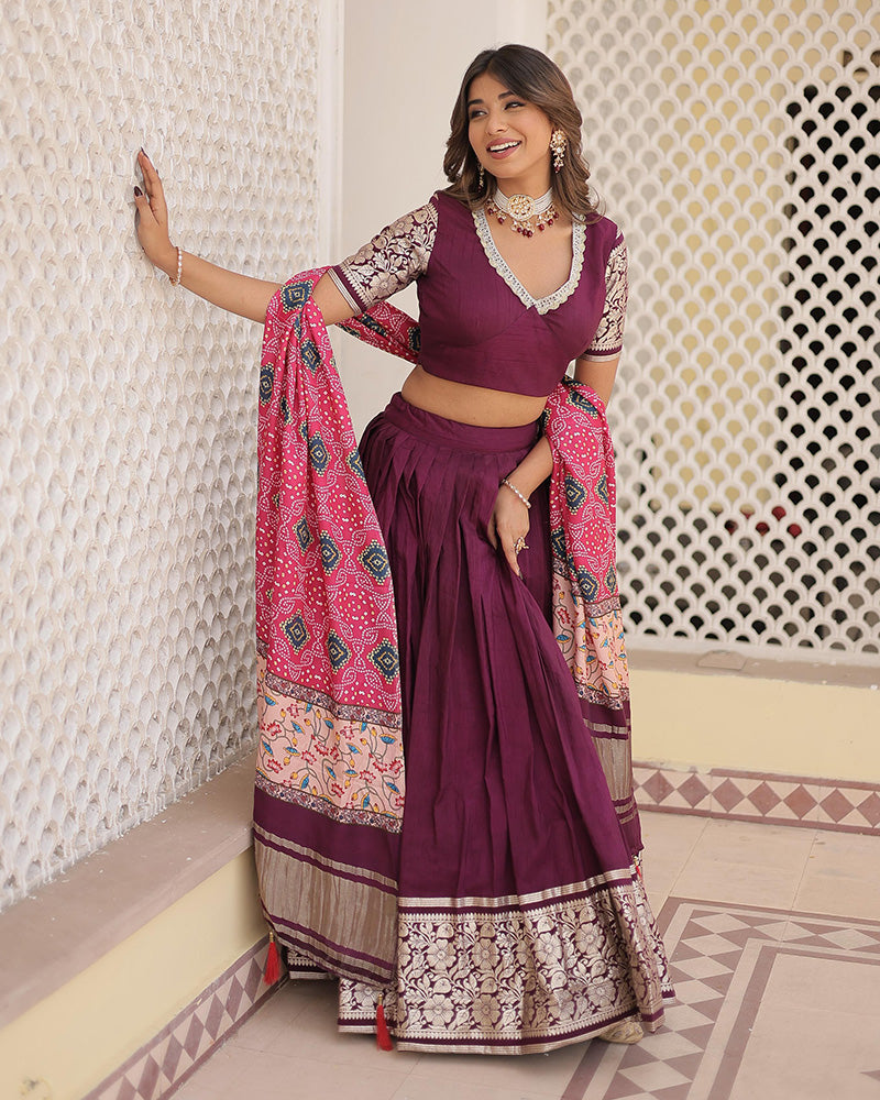 Wine Color Jacquard Lehenga Choli With Gaji Silk Dupatta