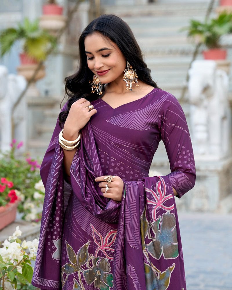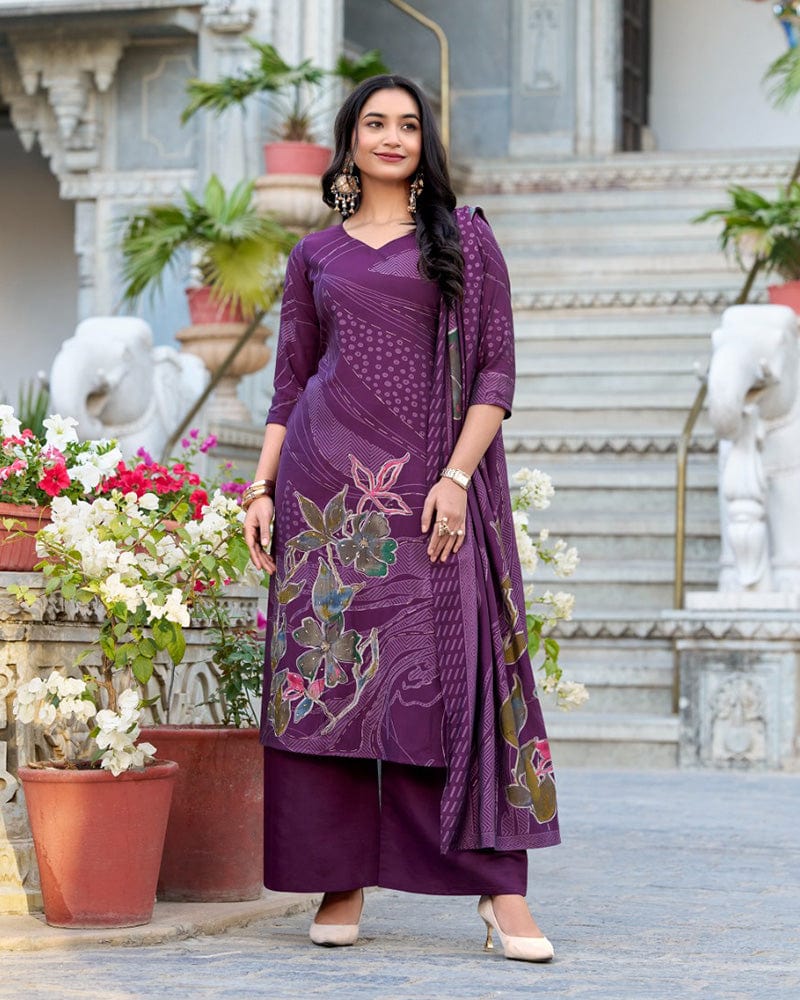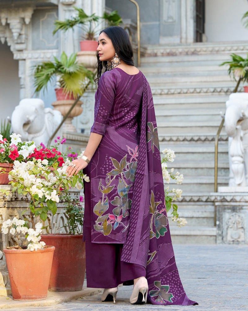 Elevate your ethnic wardrobe with this Wine Roman Silk Three-Piece Kurti Suit. Crafted from premium Roman silk, this ensemble is perfect for weddings, festive occasions, and special celebrations. Its regal color and elegant design exude sophistication and charm.