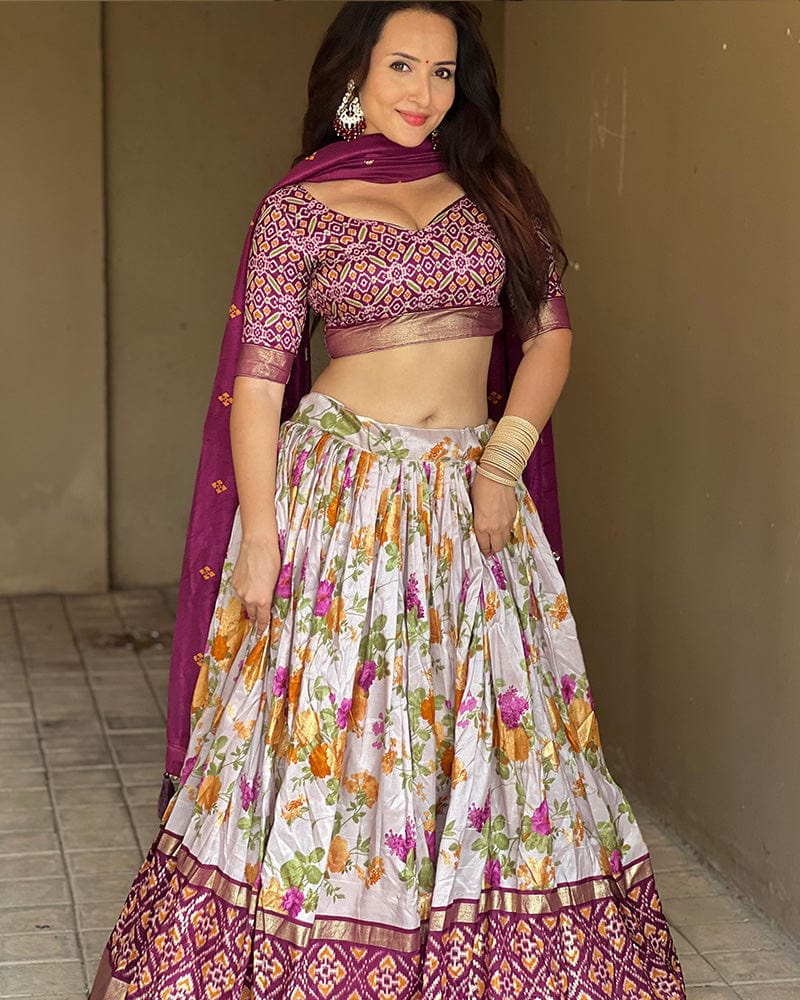 Elevate your festive wardrobe with this stunning wine color tussar silk lehenga choli, adorned with intricate floral and Patola prints. The rich fabric drapes beautifully, offering both elegance and comfort for Navratri celebrations. The vibrant patterns add a traditional yet contemporary touch, making it a perfect choice for dance and festivities. Pair it with statement jewelry to complete your look and celebrate in style!