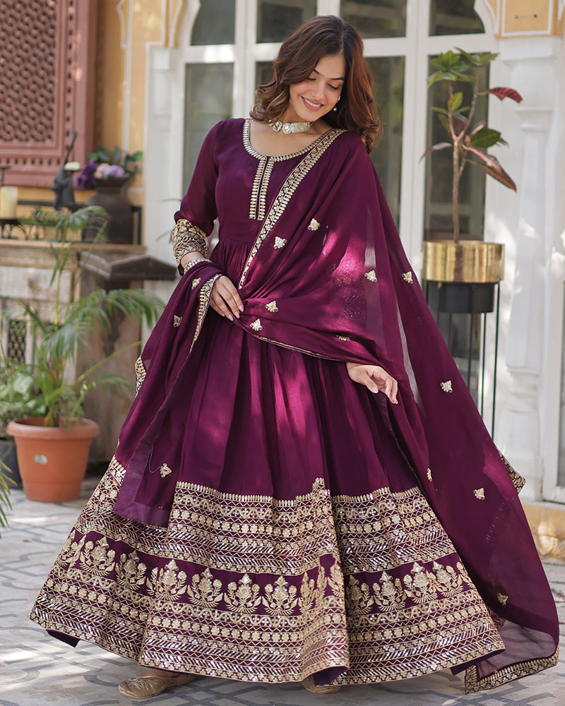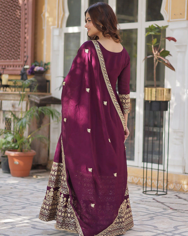 Dazzle in this Wine Vichitra Shimmer Gown, adorned with exquisite sequin embroidery for a luxurious touch. Its elegant silhouette and rich hue make it perfect for weddings, parties, and special occasions.
