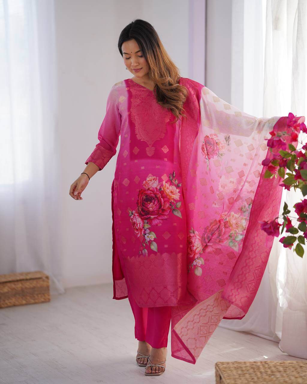 Women Floral Printed Regular Chanderi Silk Kurta with Trousers & With Dupatta