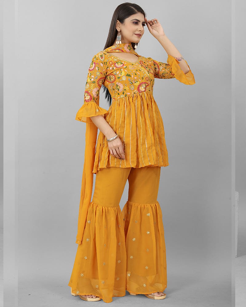 Yellow Color Georgette Embroidery work Three Piece Sharara Suit