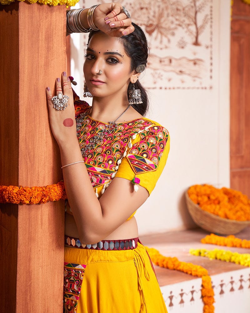 Yellow Color Viscose Rayon Thread And Mirror Work Fully Stitched Navratri Lehenga Choli